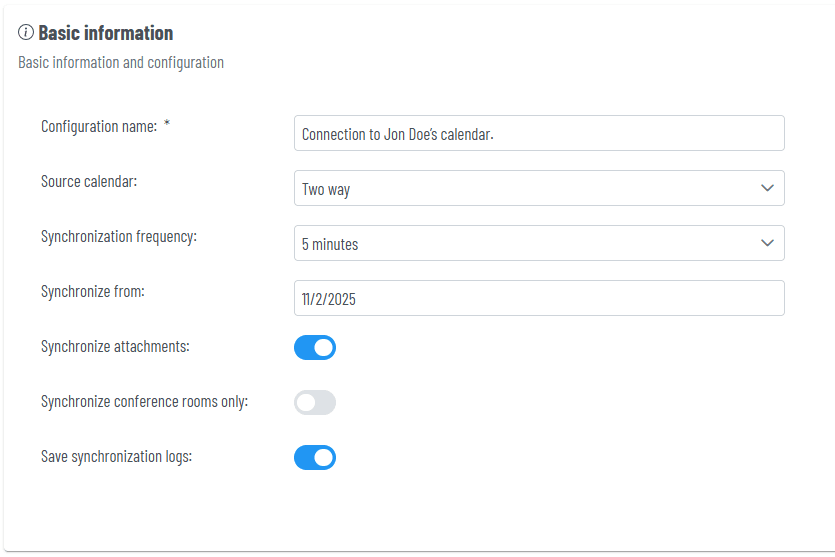 - Email address – the email address of the user to be connected to the calendar server. In the case of an OAuth connection, this field is populated automatically.